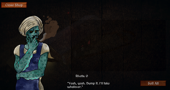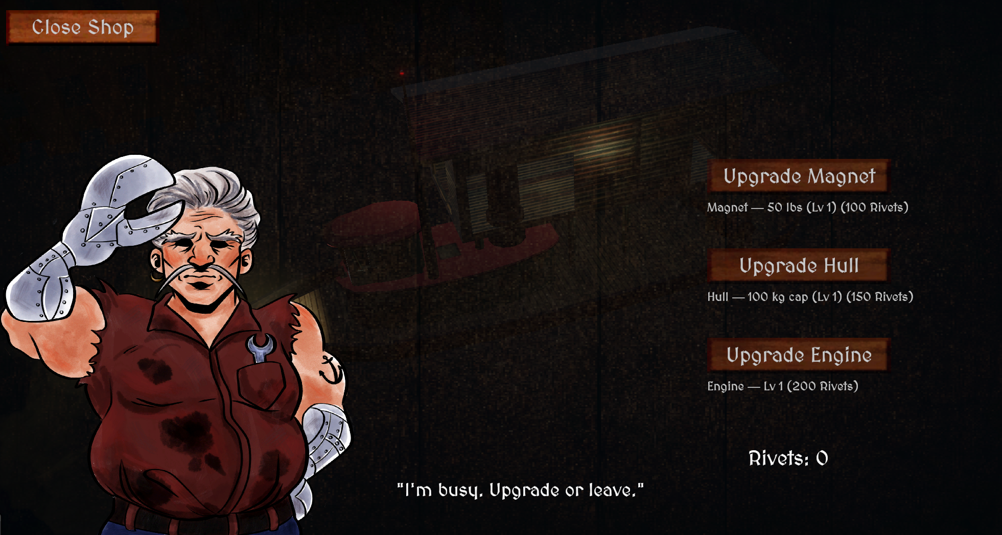 - Selling — The shop (north on the map) buys your scrap for currency (e.g. Rivets).